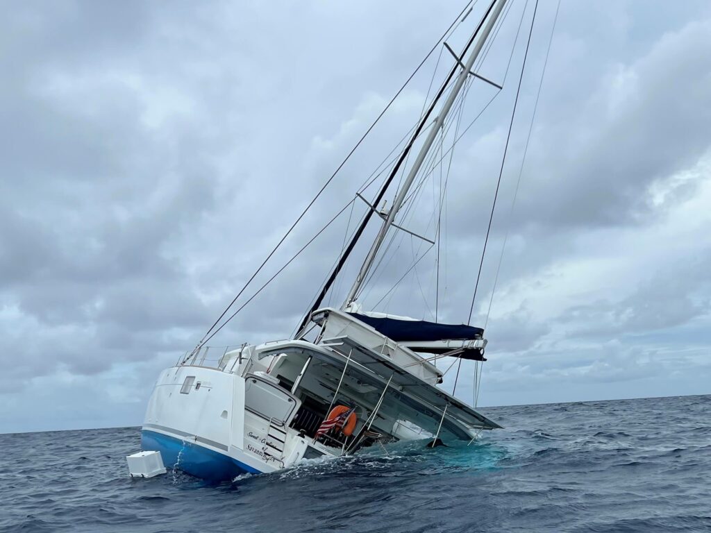 Thomas managed to get the boat off of the obstruction but it was too damaged and within 10 minutes of the original strike, the hull was filling with water fast. Within 20 minutes of the accident the boat was a third of the way sunk and we had deployed the dinghy and life raft.